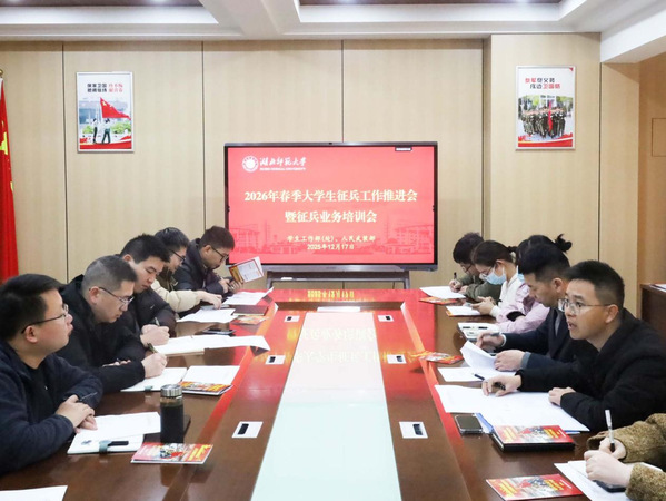 12月17日上午,学工部、人武部在“一站式”社区总站301会议室召开2026年春季大学生征兵工作推进会暨征兵业务培训会。学生工作部(处)、人民武装部副部长胡红贵,学生资助管理中心宫桃子老师,各学院负责人武工作辅导员参加会议。会议由人武部殷辉主持。