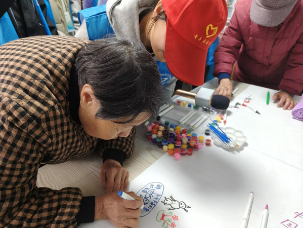 活动在“老时光盲盒”的温情分享中拉开序幕。老人们围坐一圈,从志愿者手中抽取写有不同年代的卡片,纷纷打开话匣子,讲述起年轻时的难忘故事;随后,“怀旧趣味园”里传来阵阵笑语,软沙包轻轻传递,彩色套圈缓缓落下,猜灯谜环节更是唤起大家对往昔民俗的亲切回忆;在“时光寄语墙”环节,老人们用彩色便签写下对过去的怀念、对当下的珍惜,或是一句对未来的悄悄期盼。笔迹或许颤抖,心意却真挚如初;最温馨的环节莫过于“同心绘祝福”,老人们与志愿者共同用手印、简笔画装点大幅画布,勾勒出“岁月静好,福寿绵长”的生动图景。活动尾声,志愿者为每位老人送上承载祝福的小礼品,并与大家合影留念,约定下次再见,悠扬的老歌轻唱中,温暖在彼此心间久久流淌。