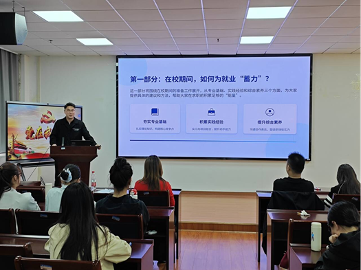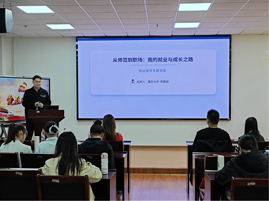 4月8日校庆日当天下午,数学与统计学院在信息大楼10603报告厅举办就业指导专题讲座,学院特邀2022届优秀毕业生、现任黄石市第七中学德体卫艺处副主任李嘉俊担任主讲嘉宾,围绕“从师范到职场:我的就业与成长之路”主题分享经验,23级、24级本科生到场聆听学习。