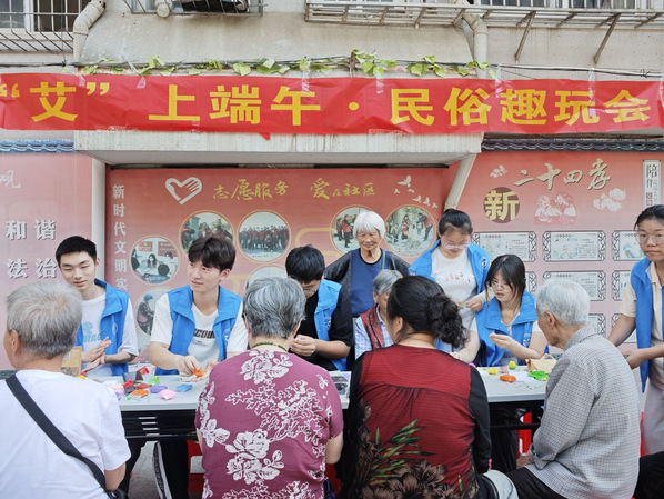 夏雨裹粽,蒲艾挂墙;端午半夏,福乐绵长。又是一年端午日,为了弘扬中华优秀传统文化,加深居民对端午节习俗的认知和喜爱,营造出浓郁的节日氛围,进一步促进邻里之间的和谐。湖北师范大学冰凌花心理健康志愿者服务队(以下简称“冰凌花队”)特于2025年5月29日在南岳社区面向全体老人开展了以“‘艾’上端午·民俗趣玩会”为主题的活动。