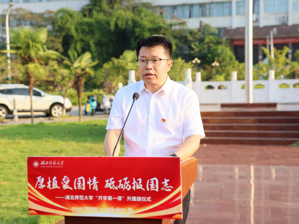 校党委书记李宏为同学们讲授“开学第一课”。他指出,历史是最好的教科书和清醒剂,中国人民抗日战争胜利具有深远历史意义。在纪念中国人民抗日战争暨世界反法西斯战争胜利80周年的重要时刻举行升国旗仪式,不仅是对新学期的庄严开启,更是对民族记忆的集体重温、对精神谱系的深刻追溯、对奋斗征程的崭新动员。他提出三点希望与师生共勉:一是厚植家国情怀,始终与时代发展和国家需要同频共振、同向同行;二是练就过硬本领,奋力以教育之笔书写新时代新征程新作为新担当;三是持续克难攻坚,坚持以昂扬姿态力争爬坡过坎乘势而上勇毅前行。他激励全体湖师人成为传承精神、发光发热的火种,做行动派、当实干家,为实现中华民族伟大复兴而努力奋斗,为推动学校“双一流”建设、决战决胜申博攻坚作出新的更大贡献。
