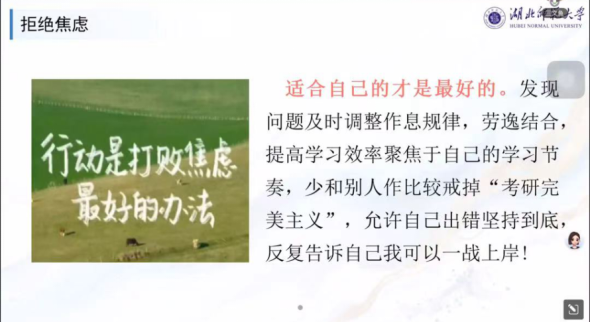 在心态调整方面,两位分享人结合亲身经历建议同学们:选择适合的学习方式,及时调整作息,做到劳逸结合;减少与他人比较,专注自身节奏;摒弃“完美主义”,允许失误并及时总结;更重要的是持之以恒,不断给自己“一战上岸”的积极暗示。