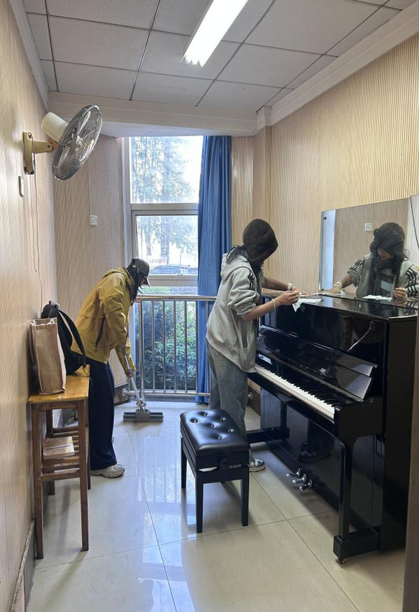 大扫除过程中,同学们全面清扫了教室、琴房、过道等区域。从墙壁到地面,从课桌椅到讲台,从门窗到门框,不放过任何一个死角,不留任何一处盲区,对教学区进行了彻底的清洁整理。教室、走廊、门窗、桌椅等每一个细节都得到认真清理,整个教学楼里外上下、方方面面焕然一新。
