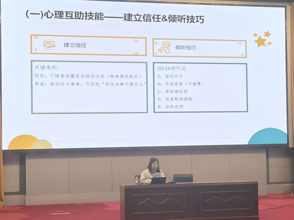 心理健康专职教师李小倩及夏婷婷老师聚焦“心理危机早期识别与上报流程”,拆解了“情绪突变”“行为异常”“言语消极”等典型信号,让宿舍长们既懂“识别”也懂“转介”。明确“看变化幅度”的判断标准,同时梳理“沟通-联系心理委员/辅导员-协助预约求助”的上报转介流程。有效推动了“校寝工作衔接”的有序开展,确保了危机高效转介,进一步筑牢寝室心理安全防线。