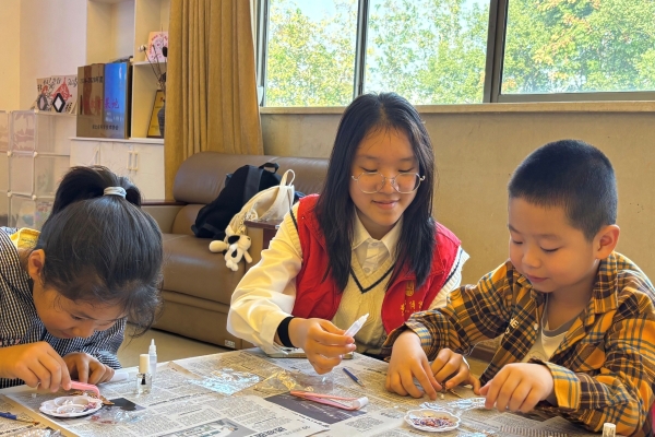 随后,志愿者引导孩子们进入“创意手工”环节,教大家用镊子夹取五彩贝壳薄片,在蝴蝶、竹子等造型的金属底胚上进行粘贴装饰,并点缀以小珍珠,最后覆盖光油“保护膜”,完成属于自己的螺钿作品。孩子们专注投入,每一片贝壳的拼贴都体现了他们对传统工艺的理解与再创造。现场气氛热烈,作品形态各异、色彩斑斓,孩子们在动手实践中深切感受到螺钿技艺的精妙与非遗传习的乐趣。