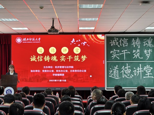 为深入贯彻落实习近平总书记关于加强诚信建设的重要指示精神,大力弘扬社会主义核心价值观,11月13日下午,经济管理与法学院联合党委办公室、校长办公室、主体责任办公室以及学报编辑部,在信息大楼报告厅共同组织开展了以“诚信铸魂,实干筑梦”为主题的2025年道德讲堂活动。相关举办单位领导、教师、经管法学院第71期入党积极分子以及2025级学生代表共同参与。