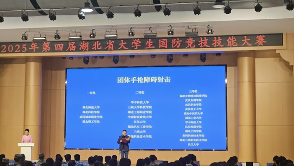 在刚刚落幕的2025年湖北省第四届大学生国防竞技技能大赛中,我校代表队奋勇争先,载誉而归,综合成绩位列全省前列,斩获团体个人20余奖项,团体一等奖3项,二等奖1项,三等奖1项,优秀组织奖1项,个人一等奖6名,二等奖3名,三等奖3名,综合优秀奖2名。