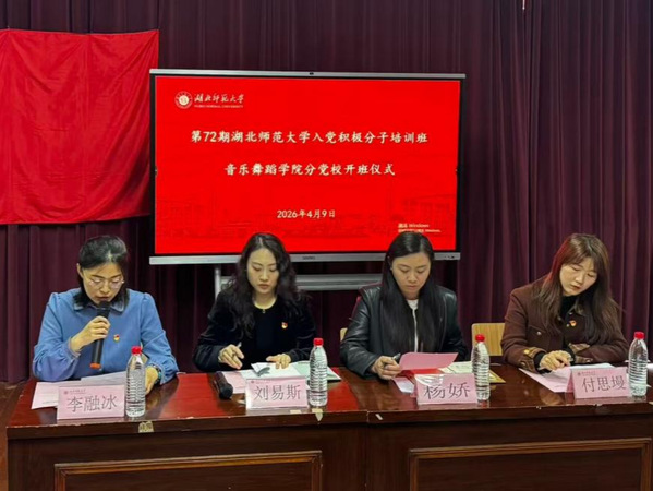 为深入学习贯彻习近平新时代中国特色社会主义思想,强化入党积极分子的思想淬炼与政治引领,筑牢青年学子理想信念根基。4月9日下午,音乐舞蹈学院分党校第72期入党积极分子培训班开班式在音乐楼13316顺利举行,出席本次开班式的有湖北师范大学组织部副部长、党校副校长杨娇,音乐舞蹈学院党委副书记刘易斯,学生第一党支部书记付思墁,学生二党支部书记、分党校班主任李融冰,以及第72期入党积极分子培训班全体学员。此次开班式由李融冰老师主持。
